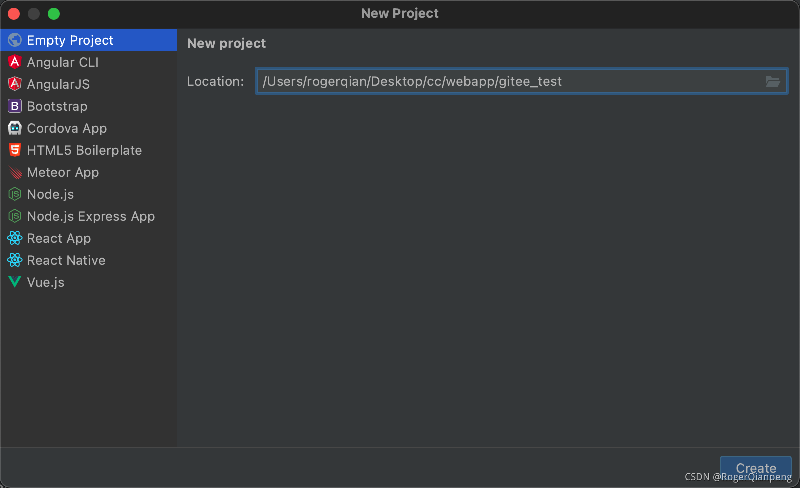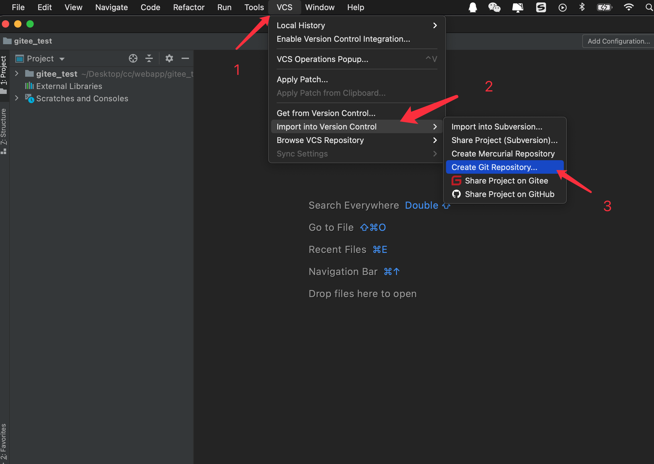 先创建一个本地仓库 5.1 如果不是mac或者窗口界面不一样也没关系,找到“Create Git Repository”即可  5.2 直接默认项目位置即可  -