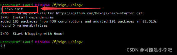 在blog文件夹内,右击 git bash here 打开的命令框中输入 hexo init -