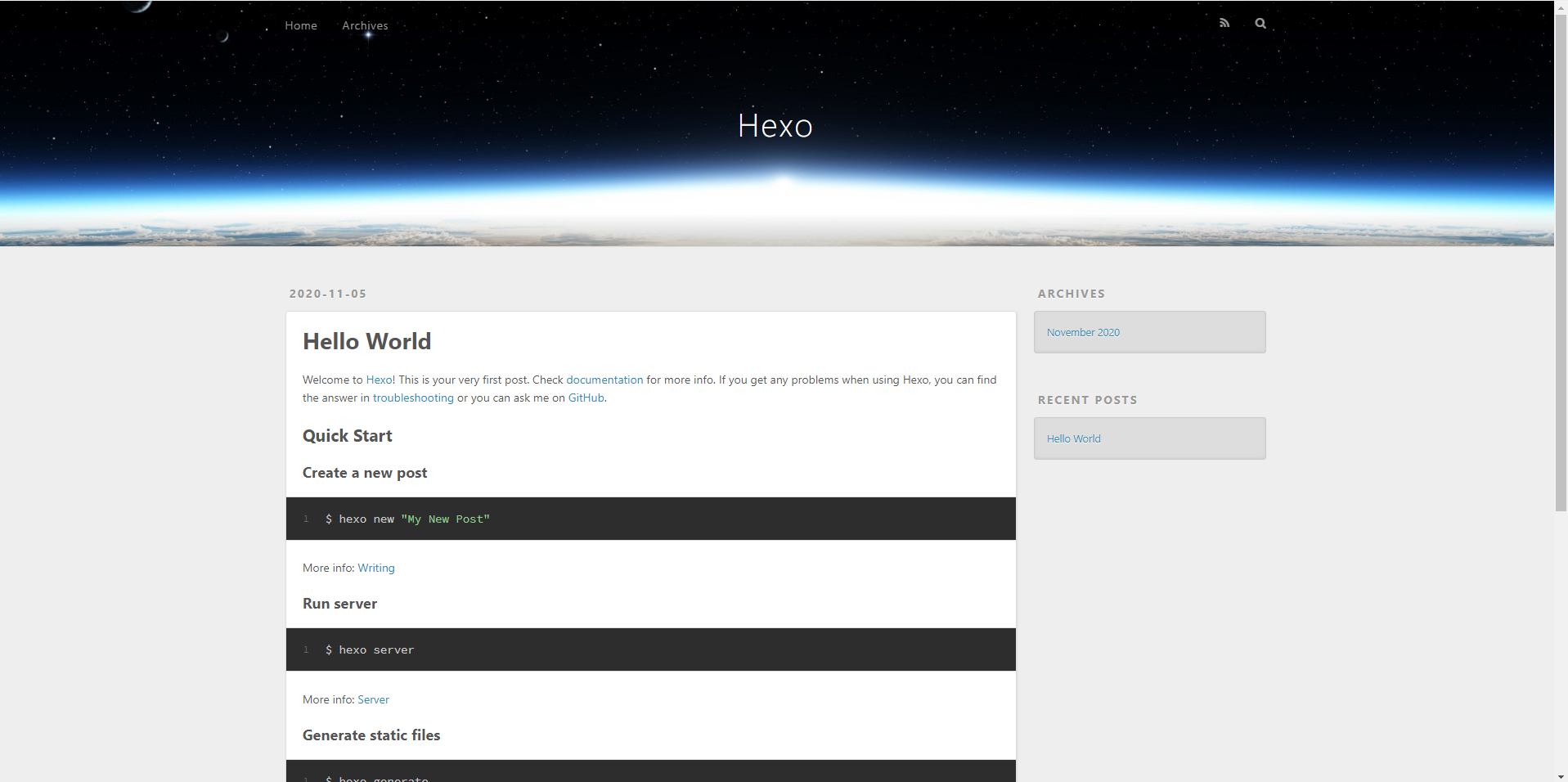 到这里基本就算完成了,可以输入 hexo server 或偷懒直接输 hexo s 启动服务  -