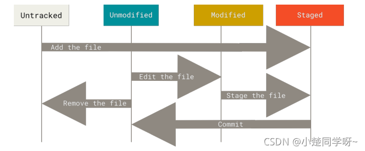 Unmodify: 文件已经入库, 未修改, 即版本库中的文件快照内容与文件夹中完全一致. 这种类型的文件有两种去处,?如果它被修改, 而变为Modified. 如果使用git rm移出版本库, 则成为Untracked文件 -