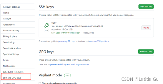 1.?? ?生成两对密钥 进入目录“C:\Users\4746\.ssh”,执行 ssh-keygen -t rsa -f ~/.ssh/id_rsa_guxiao -C yourmail@xxx.com 文件名最好有意义 命令执行完,就出现如下文件 ? 2.?? ?在 .ssh 文件夹下新建 config 文件并编辑, # one ? ? ? ? ? ? ? ? ? ? ? ? ? ? ? ? ? ? ? ? ? ? ? ? ? ? ? ? ? ? ? ? ? ? ?? Host 简称 HostName 域名 User guxiao IdentityFile ~/.ssh/id_rsa_guxiao # two ? ? ? ? ? ? ? ? ? ? ? ? ? ? ? ? ? ? ? ? ? ? ? ? ? ? ? ? ? ? ? ? ? ? ? ? ?? Host github HostName github.com IdentityFile ~/.ssh/id_rsa_vicky User vickyjonh? 3.?? ?将生成的 id_rsa_guxiao.pub,id_rsa_vicky.pub内容copy 到对应的 repo