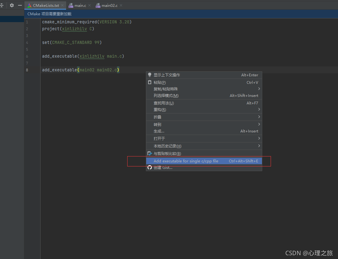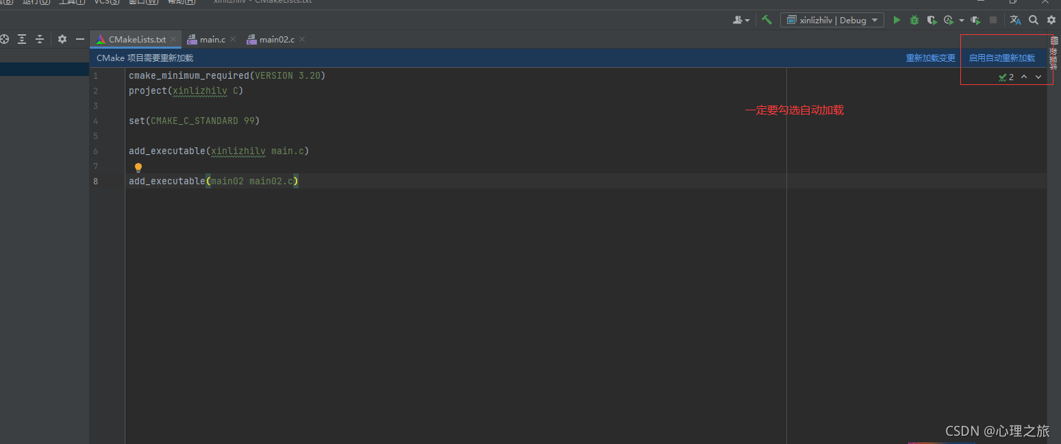 ?回到CMakeLists.txt中,点击自动加载,不然会没有运行按钮