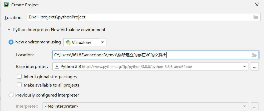 搭建一个虚拟环境是件十分麻烦的事情,再娴熟的人也要花费个把小时,因为有一大堆包需要下载。 点击File—>Create Project,选择新环境,按照如下目录搭建虚拟环境,不过注意,必须现在C:\Users\86183\anaconda3\envs创建一个存放虚拟文件的文件夹,可以自己命名。一定要在找个目录,否则接下来需要包将下载失败,或无法运行。 或者用Anaconda Prompt到该目录下,用命令行方式创建。
