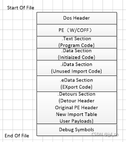 ? ? ? 要修改Windows二进制文件,Detours在导出表和调试符号之间创建一个新的. Detours部分,如上面图所示。注意,在Windows二进制文件中,调试符号必须总是位于最后。新section包含一个detours头记录和一个原始PE头的副本。如果修改导入表,Detours将创建新的导入表,将其附加到复制的PE头,然后修改原始PE头以指向新的导入表。最后,Detours在. Detours部分的末尾写入任何用户有效负载,并附加调试符号以完成文件。Detours可以通过从. Detours部分恢复原始PE头并删除. Detours部分来逆转对Windows二进制文件的修改。上图显示了经过detours修改的Windows二进制文件的格式。