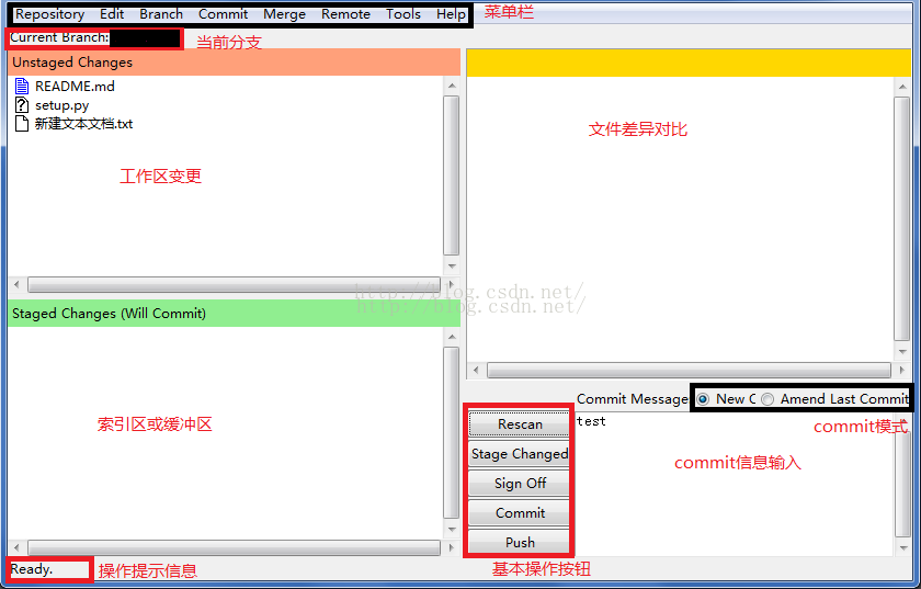 4.基本操作按钮:stage changed:将工作区的所有变更提交到添加到索引区;(其他在菜单栏中都有对应项,介绍菜单栏时一并介绍)