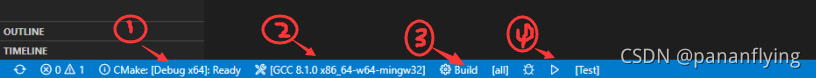 ? ? ? ? ?最后我们终于可以开始编译代码运行了。确认如下图1处选择了编译的选项后,确认图2处选择了GCC的kit后,点击图3处的build,再点击图4的三角形进行运行。