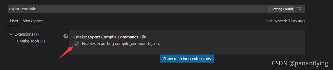 ? ? ? ? ?另外需要特别的配置是勾选cmake-tools的导出compile_commands.json这个文件,这个文件用在clangd寻找依赖的时候用到的。通过CMake Tools右侧设置按钮点出的菜单选择Extension Settings,在弹出的界面上方输入export compile进行搜索,然后勾选第二张图所示。
