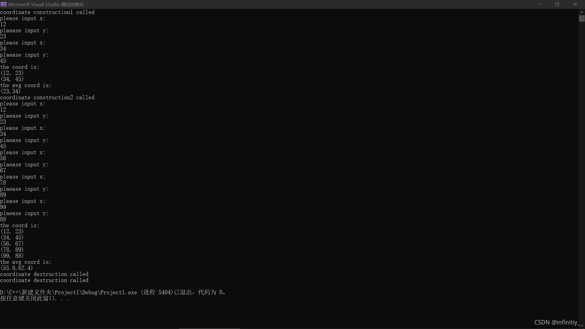 上机感受:此次实验突出C++对比C的特点,内容为输入多个二维坐标,输出坐标均值。每个类的创建需要仔细,一开始在输入代码时漏掉了括号,分号等符号,导致错误频频,还有析构函数要又~开始,析构函数()内没有内容,这些都是需要注意的。在源代码加上y后就是输入两组数据,输出两组均值。总的来说这次对类有些体会,层层建立。