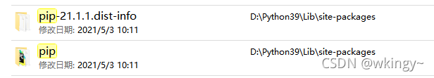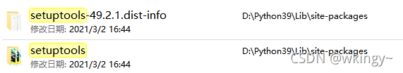 1、打开自己电脑python安装目录--->lib--->site-packages,例如D:\Python39\Lib\site-packages,在搜索框输入pip找到pip和pip-21.1这2个文件夹(根据自己版本选择,数字可能不是21可能是20或其它)、输入setuptools找到setuptools和setuptools-49.2(版本号同理)。
