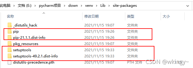 ?2、打开pycharm新建的项目所在目录下的\venv\Lib\site-packages例如E:\pycharm项目\down\venv\Lib\site-packages,将红框内的4个文件夹删掉,再将第一步找到的4个文件家拷贝过来,切记要先删除掉再拷贝,否则容易出现意想不到的错误!!!!!!!!