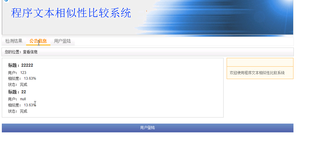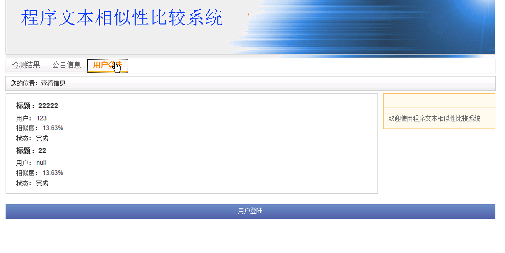 二、功能介绍 ?随着网络技术的飞速发展,信息共享度不断升级,一方面为人们获取资料提供了方便,另一方面也为抄袭、剽窃、非法扩散等不道德行为提供了可剩之机。文本抄袭检测技术逐渐成为自然语言处理领域中一项重要的研究课题。我的课题主要是针对为了防止学生抄袭作业而编制软件,实现将两篇源程序(代码)进行比较,将内容相同或相似的部分显示出来,警醒学生别抄袭作业。 ? 具体要求:为了防止学生抄袭作业、实验报告、课程设计中源程序(代码),编制软件,实现将两篇源程序(代码)进行比较,将内容相同或相似的部分显示出来,并得出结论。例如:对.txt,.c,.java,.cpp,.htm或.html等文本进行比较。突出计算机技术在防止作业抄袭的应用研究。 ? ? 程序文本相似性比较内容包括四种类型,分别是完全相似的源代码、非连续的相似源代码、参数化相似源代码、近相似源代码。实现对.txt等文本进行比较的功能。 ?前台: (1)登录模块:用户登录,只能拥有判断文本是否抄袭的功能。 (2)注册模块:未注册的用户不能判断文本 。 (3)页面模块 1)简介模块:显示软件的基本功能模块。 2)判断模块:将两篇文本进行判断,将内容相同或相似的部分显示出来,并得出结论。 ?后台: (1)管理员登录:管理员具有相关权限,包括对用户、功能菜单和被比较文本的管理功能。 1)用户管理:管理员管理用户基本信息,涉及人员的身份认证,登录信息验证。 2)用户意见:及时处理用户提交的反馈意见,整理总结。 ? 3)添加其他相关的功能。如记录用户搜索。 ? 说明:系统采用两种比较常见的文本检测对比方法 编辑距离 和 余弦定理 三、注意事项 ?? ?1、管理员账号:admin密码:admin 数据库配置文件DBO.java ?? ? 2、开发环境为TOMCAT7.0,Myeclipse8.5开发,数据库为mysql5.0,使用java语言开发。 ?? ?3、数据库文件名是jspfjiance,系统名称jiance ?? ?4、系统首页地址:login.jsp