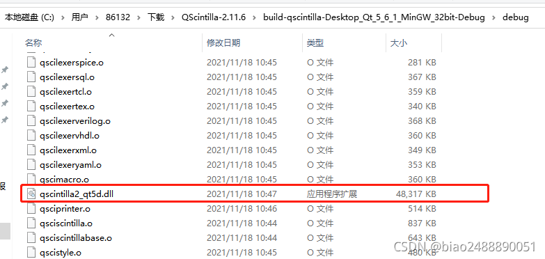 - ?编译完成,会在Debug目录生成我们需要的库文件qscinilla2_qt5d.dll文件(注:该库文件和Release编译的库文件不通用,如果我们需要发布软件,需要重新编译),这是windows系统中用的动态链接库文件,跟我们的qt库xx.dll文件类似。