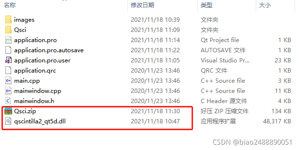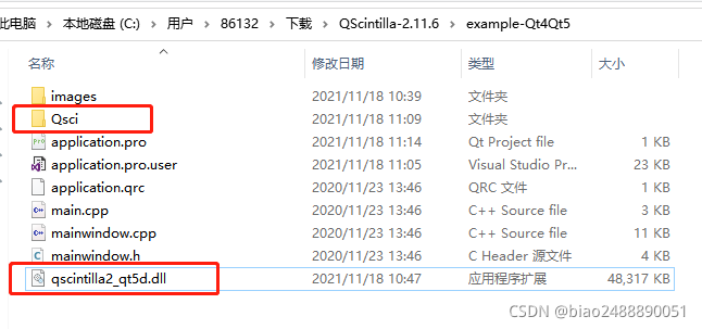 - 这里以给的例子为例,在example-Qt4Qt5中。将QT4QT5中的QSci头文件夹拷贝到我们的工程里,同时将qscintilla2_qt5d.dll库文件拷贝过来。