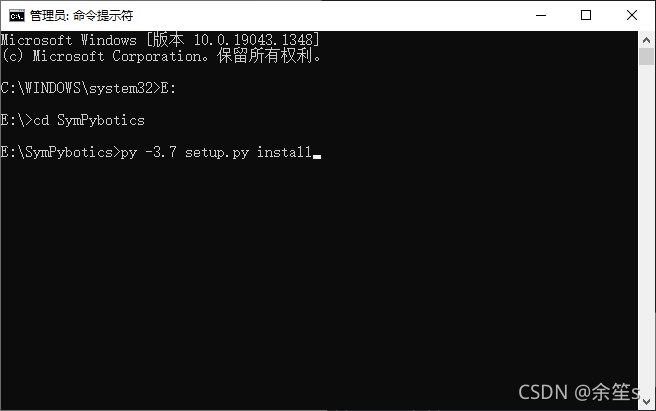 管理员模式运行cmd,使用命令行进入SymPybotics文件夹。例如将代码克隆到了E盘,如下图所示运行命令进入文件夹