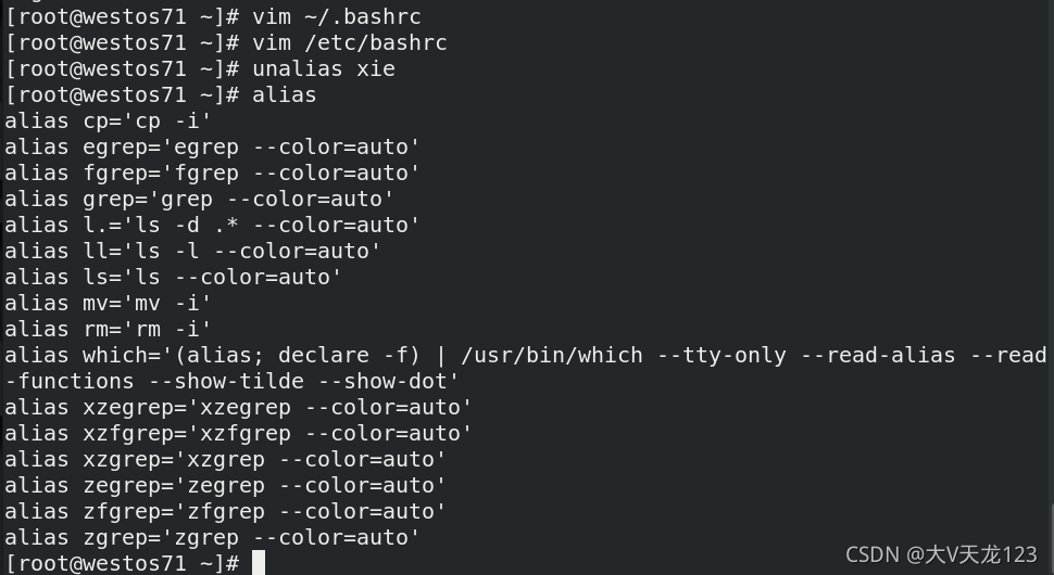 alias xie='vim'? ? ##临时设定 vim ~/.bashrc alias xie='vim'? ? ##只针对与用户生效  vim /etc/bashrc? ##针对系统所以用户生效 alias xie='vim'  unalias xie? ? ? ? ##删除当前环境中的alias?