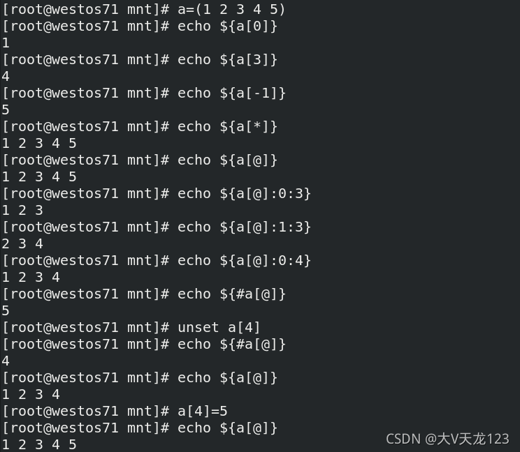 a=(1 2 3 4 5) ${a[0]}?? ?数组第一个元素 ${a[-1]}?? ?数组最后一个元素 ${a[*]}?? ?所有元素 ${a[@]}?? ?所有元素 ${a[*]:1:4}?? ?第2-5个元素 ${a[@]:1:4}?? ?第2-5个元素 ${#a[@]}?? ?元素个数 ${#a[*]}?? ?元素个数