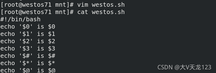 $0? ? ?##脚本本身 $1? ? ?##脚本输入后的第一串字符 $2? ? ?##脚本输入后的第2串字符 $3? ? ?##脚本输入后的第3串字符 $#? ? ?##脚本后输入字符串的个数 $*? ? ? ##脚本输入的所有字符(一个整体) $@? ? ##脚本输入的所有字符(多个整体) $$? ? ? ##脚本运行的当前进程ID号 $!? ? ? ?##后台运行的最后一个进程的ID号 $?? ? ? ##显示最后命令的退出状态。0表示没有错误,其他任何值表明有错误