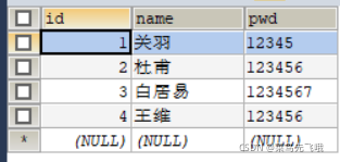 ?insert ?into `user`(`id`,`name`,`pwd`) values (1,'关羽','12345'),(2,'杜甫','123456'),(3,'白居易','1234567'),(4,'王维','123456');