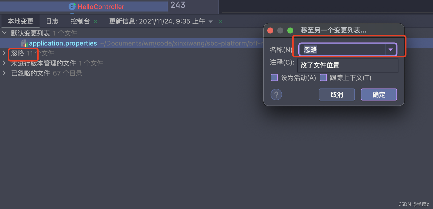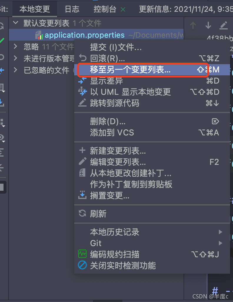 将文件纳入ignored list 此时,修改了application.properties,它会在Default里出现,如果我们不想提交,拖动文件到忽略的changelist