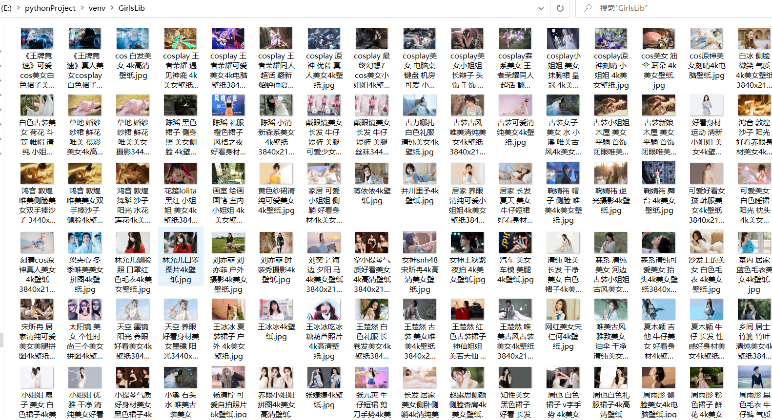 根据你pycharm存放的路劲在自己的计算机找到存储的地方,找到GirlsLib即可,效果如下只是爬取其中美女那一部分的前六页,有兴趣可以对代码进行改写爬取另外的分类图片,爬多少页都可以自己制定,就是这么简单!!!赶快学起来,再也不用一个个点着下载了!!!