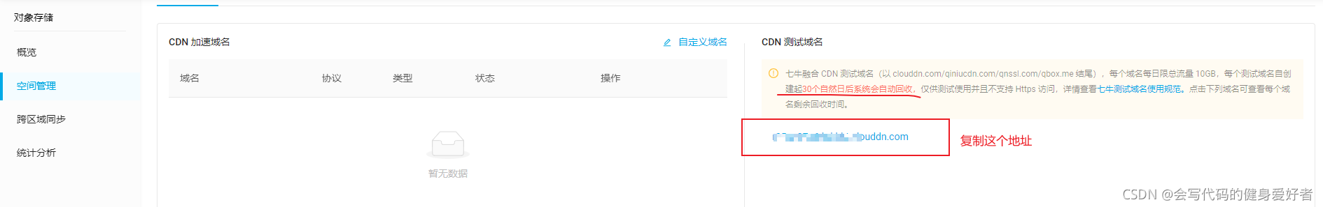 //这里就是创建好存储空间之后,点开可以在右侧看见的测试域名,30天更新一次