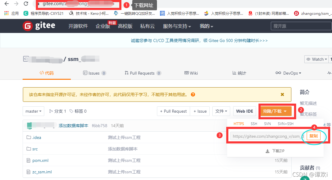 1.首先先找到需要导入项目的网址,点克隆/下载,复制链接