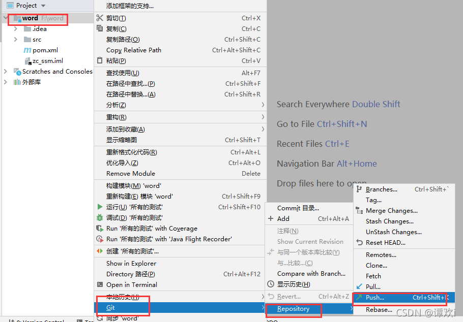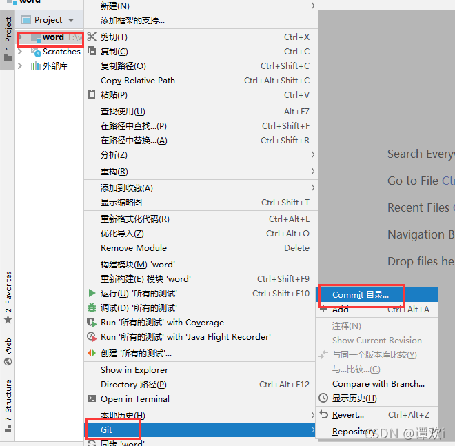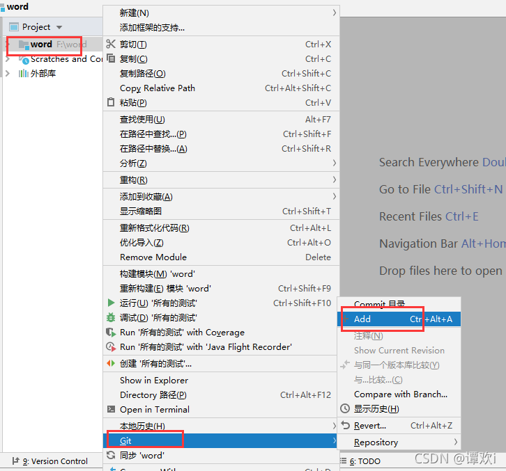 ?3.点击项目目录右键,此时会出现一个git,这是仓库创建成功才会有的。然后点击add添加到缓冲区