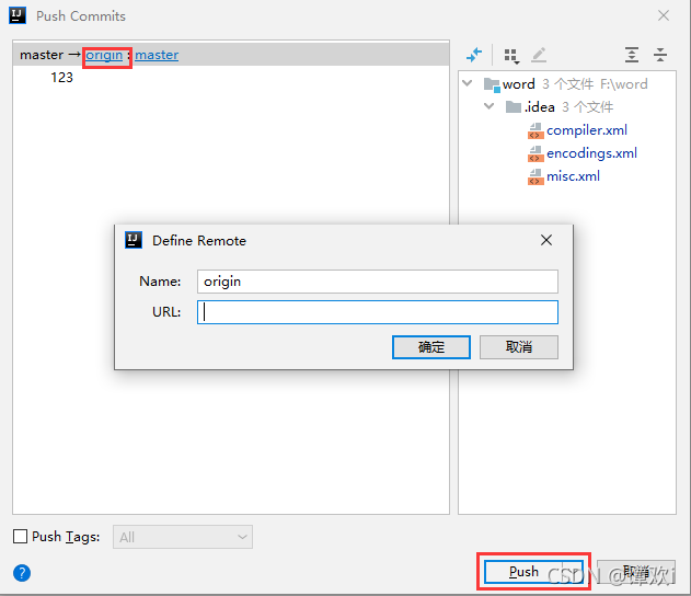 ?7.点击orign→DefineRemote,进入远程定义,填入你的项目名和远程地址的链接,先去你的码云找到项目地址的链接复制下来,然后填入到远程定义中,然后点击push。