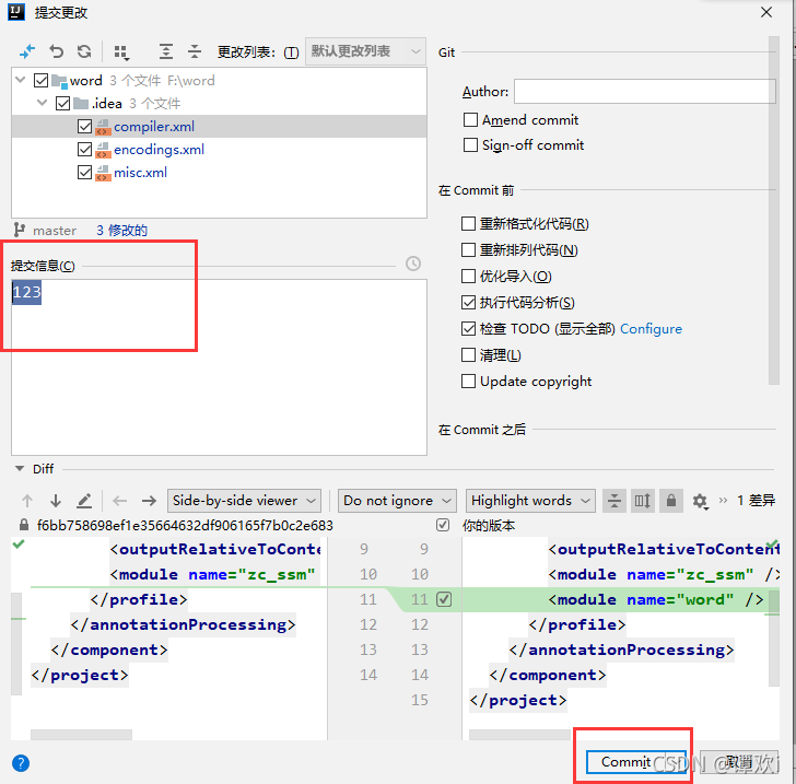 ?5.选择要提交的目录文件,和信息,然后点击commit