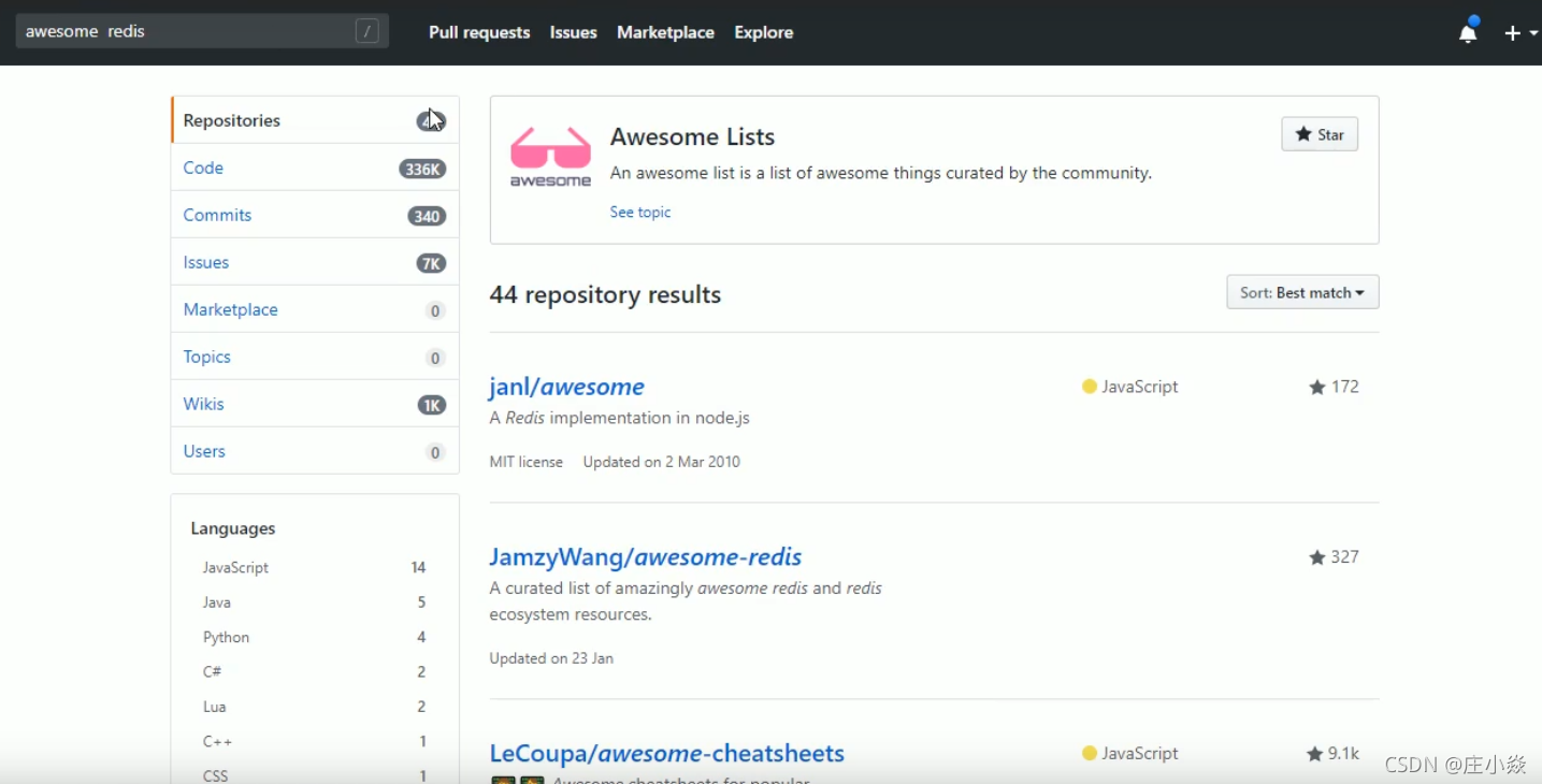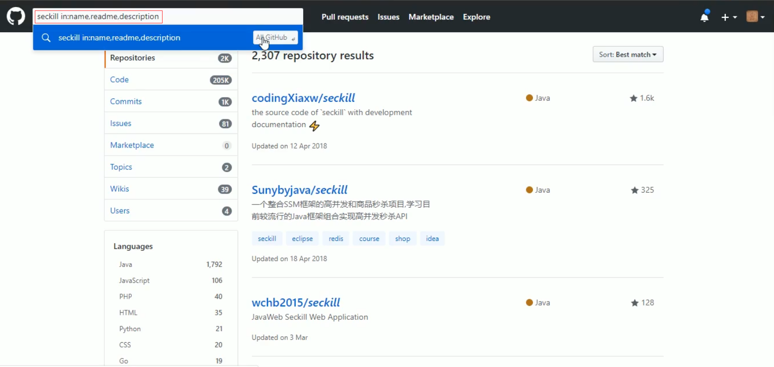 公式:xx关键词 in:name 或 description 或 readme