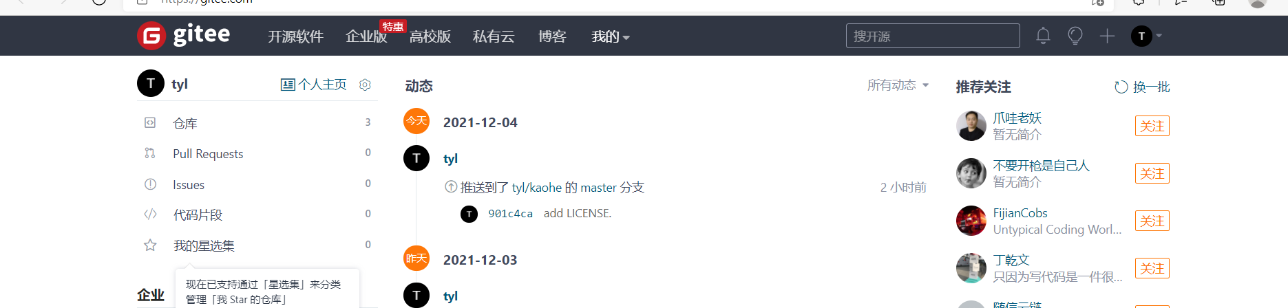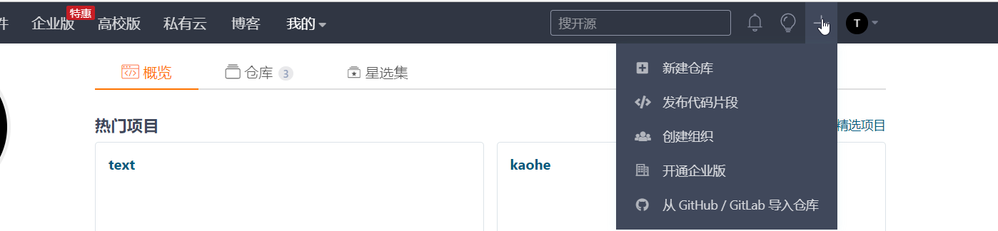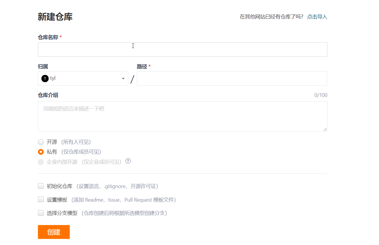 点新建仓库  根据个人需要去选择开源还是私有,及初始化里选择语言,编程软件和开源许可证。选完之后点创建即可。 创好之后就可以把自己的代码上传了。