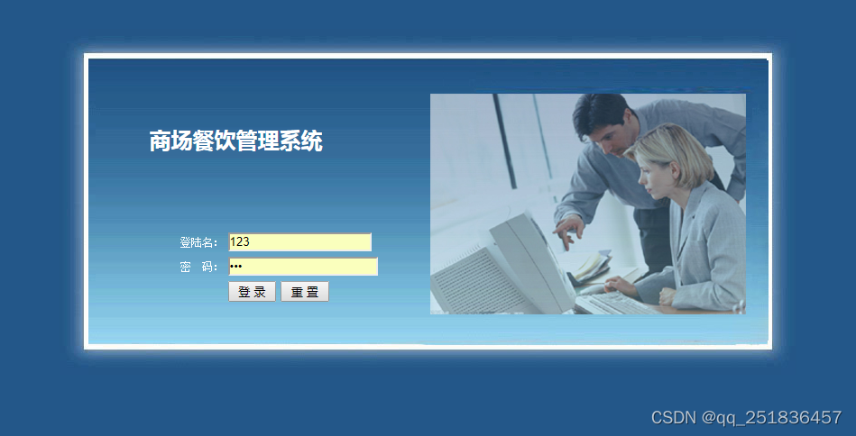 二、功能介绍 设计一个基于JSP的商场餐饮管理系统,可以帮助在商场消费的顾客更好的体验商场的周到服务和特色美食,节省顾客时间,既提高了商场餐饮部的服务质量,又可以扩展顾客群,并且可以最大程度地实现信息管理的电子化。该管理系统主要包括商场餐饮管理和入驻餐厅业主的餐厅管理两个模块,商场通过后台管理商场的所有餐厅,餐厅业主通过浏览器管理个人经营的餐饮店面,该系统后台采用数据库存储信息。这些模块之间相互联系,相互配合,构成一个完整的商场餐饮管理系统 商场餐饮管理系统要满足以下几个方面的功能需求: (1)管理员权限具有以下功能: 权限管理:对权限信息进行添加、删除、修改和查看 用户管理:对用户信息进行添加、删除、修改和查看 商家级别管理:对商家级别信息进行添加、删除、修改和查看 商家管理:对商家信息进行添加、删除、修改和查看 (2)商家用户权限具有以下功能: 菜单管理:对菜单信息进行添加、删除、修改和查看 订单管理:对订单信息进行添加、删除、修改和查看 统计查询:销售月查询,销售财务日查询 (3)操作用户权限具有以下功能: 卡号管理:对卡号信息进行添加、删除、修改和查看 三、注意事项 1、管理员账号:admin密码:admin 数据库配置文件DBO.java 2、开发环境为TOMCAT7.0,Myeclipse8.5开发,数据库为SQLSERVER2008,使用java语言开发。 3、数据库文件名是jspfsjxf.mdf ,系统名称sjxf 4、地址:login.jsp