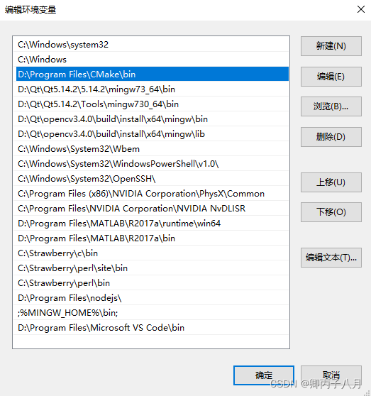 解决方案二:添加path,注意,安装完cmake仅需添加“D:\Program Files\CMake\bin”这一条path,其下面四条path可在安装完成后添加   问题三:在cmake里Configure时,不按照给定的编译器编译相关源文件 解决方案三:删除Qt里以前安装过或者不正确的编译器,并且删除环境变量里多余的path,参考方案二。删除Qt内的编译器先打开Qt,选择“工具”–“选项”–“编译器”,删除提示错误的编译器。   方案四:出现如下错误,或者提示opencv_core.dll、libopencv等错误,可能是文件存放位置不对,mingw32-make -j16时找不到对的源码文件位置或者编译文件存放位置不正确。 mingw32-make[2]: *** [modules\highgui\CMakeFiles\opencv_highgui.dir\build.make:133: modules/highgui/CMakeFiles/opencv_highgui.dir/src/window_QT.cpp.obj] Error 1 mingw32-make[2]: *** Waiting for unfinished jobs… mingw32-make[2]: *** [modules\highgui\CMakeFiles\opencv_highgui.dir\build.make:158: modules/highgui/CMakeFiles/opencv_highgui.dir/src/moc_window_QT.cpp.obj] Error 1 mingw32-make[1]: *** [CMakeFiles\Makefile2:3158: modules/highgui/CMakeFiles/opencv_highgui.dir/all] Error 2 mingw32-make[1]: *** Waiting for unfinished jobs… [ 63%] Built target opencv_dnn mingw32-make: *** [Makefile:162: all] Error 2 解决方案四:将opencv的source源码文件和存放编译后文件的文件夹build放在同一级目录下,如下图所示。 cmake的文件夹选择:  新建“opencv3.4.0”,在文件夹下新建“source”的“build”文件夹。  “source”文件夹用于存放opencv3.4.0的源码文件。  “build”文件夹用于存放编译后的文件,在执行cmake的Configure之前是空的。  之后进行Configure和Generate就行了,还要注意一定要把cmake要选择的选项选择完全,有事Configure之后有些选项会取消勾选。希望我写的这些坑可以帮你排排雷。  install