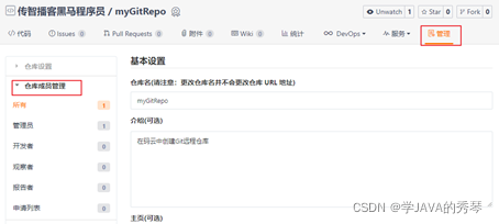 ????????前面已经在码云上创建了自己的远程仓库,目前仓库成员只有自己一个人(身份为管理员)。在企业实际开发中,一个项目往往是由多个人共同开发完成的,为了使多个参与者都有权限操作远程仓库,就需要邀请其他项目参与者成为当前仓库的成员。