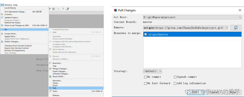 - Pull:拉取,就是将远程仓库代码下载到本地仓库