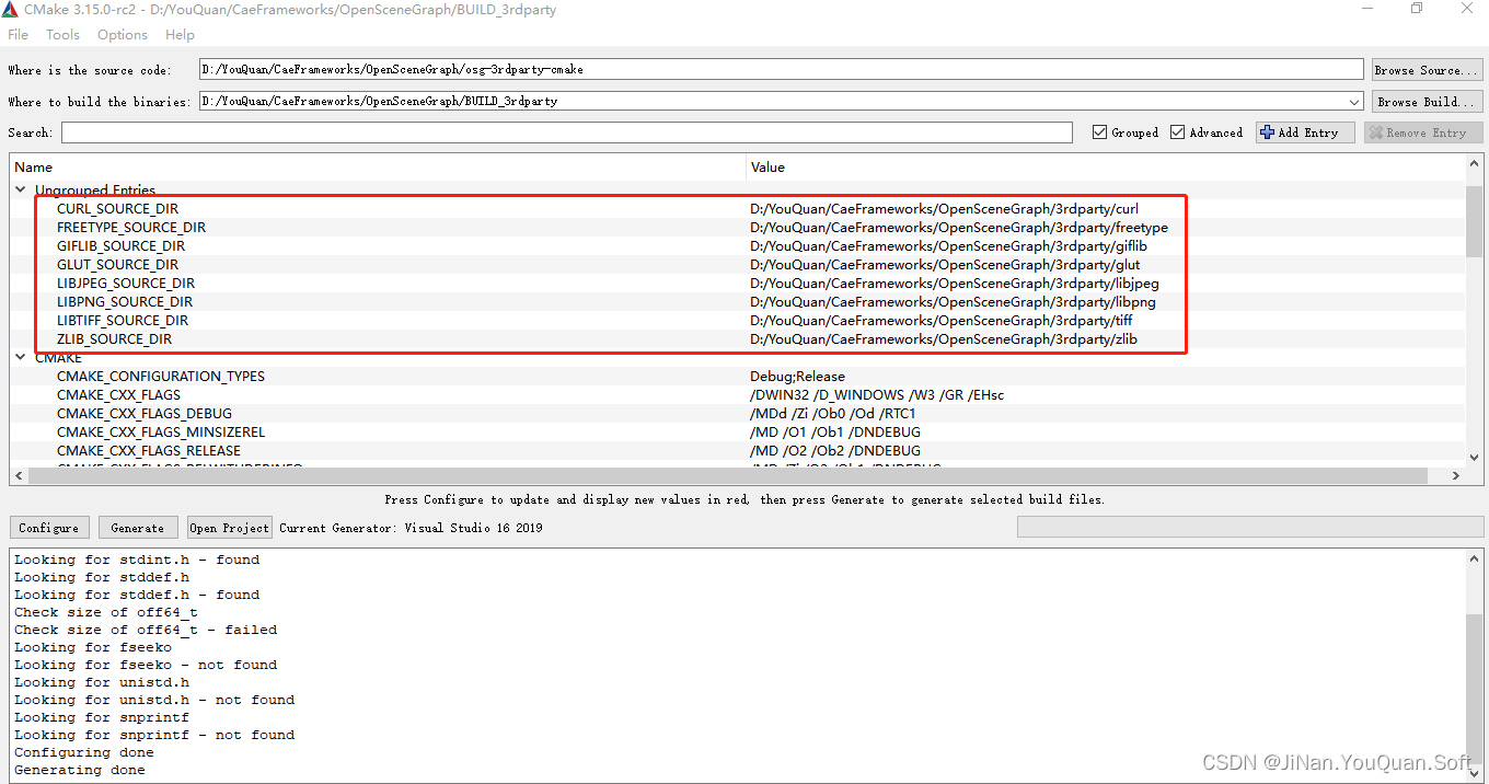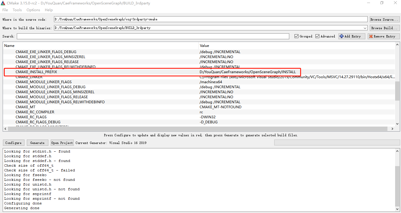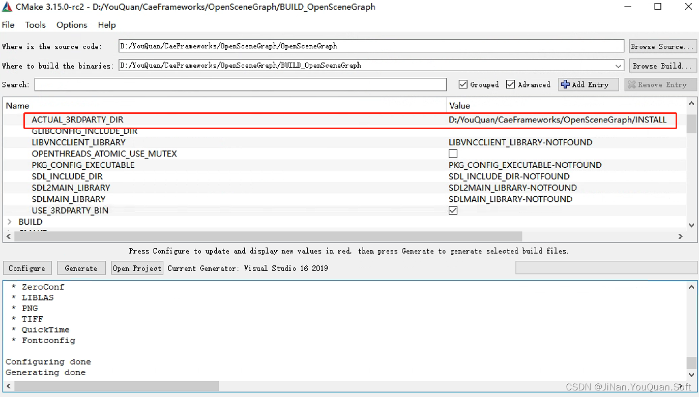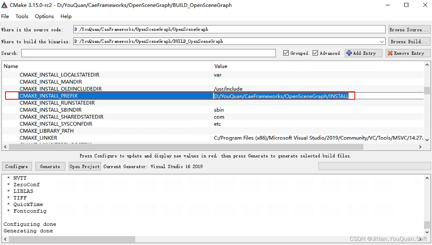 配置“CMAKE_INSTALL_PREFIX”为"D:\YouQuan\CaeFrameworks\OpenSceneGraph\INSTALL"?