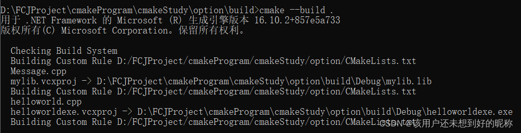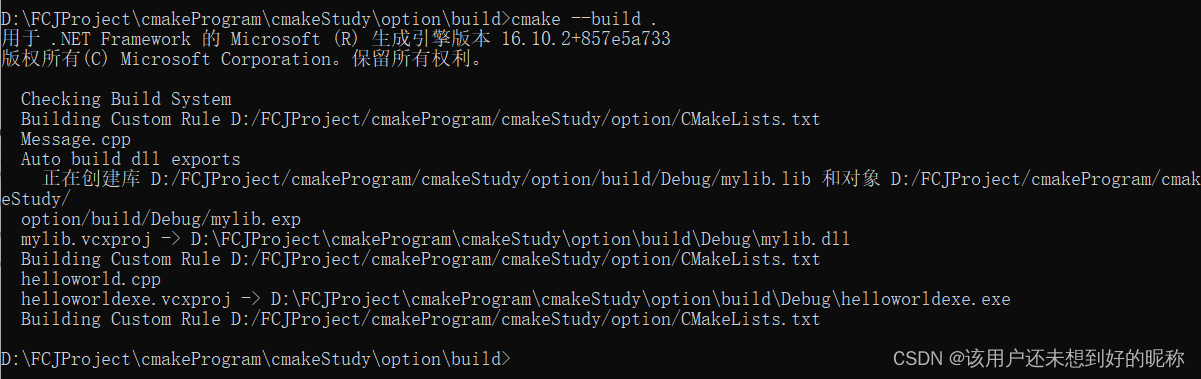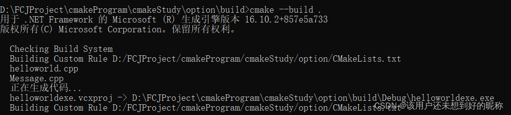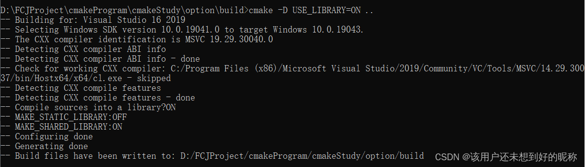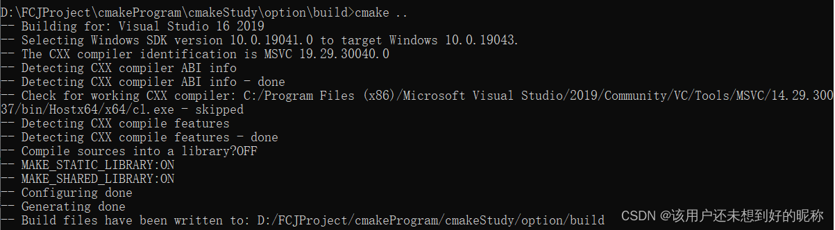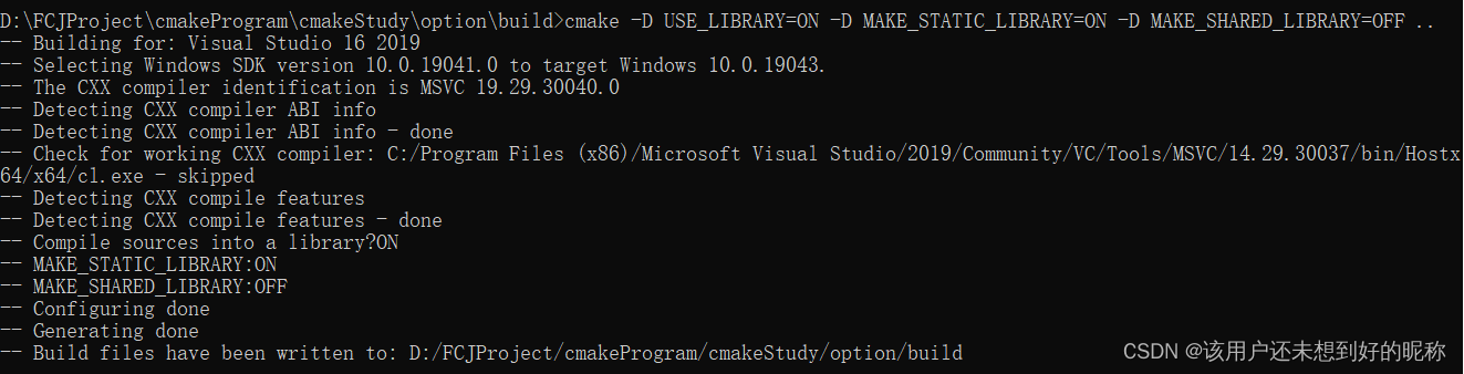 ????????上方的代码有个缺陷,就是我们切换生成器行为时需要手动更改CMakeLists.txt中的USE_LIBRARY。option() 命令以选项的形式显示逻辑开关,用于外部设置,可以使用option( )切换构建系统的生成行为。