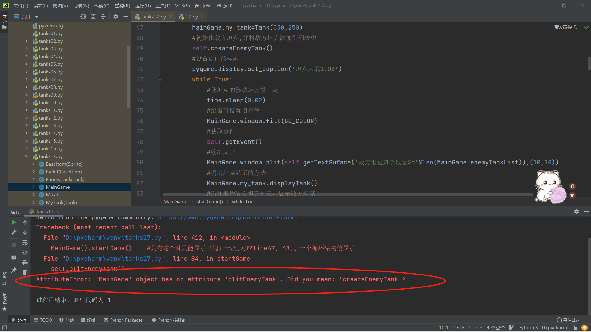 代码我与源码对照了,但还是报错“AttributeError: 'MainGame' object has no attribute 'blitEnemyTank'. Did you mean: 'createEnemyTank'?”,有哪位大佬能帮忙解决一下问题吗?感谢大佬们