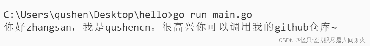 fmt.Printf("你好%s,我是qushencn。很高兴你可以调用我的github仓库~\n", name)