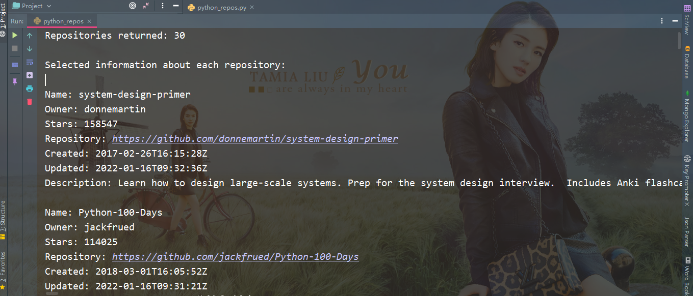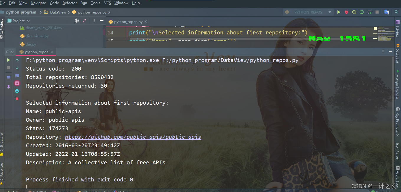 ??在这里我们首先打印了表示第一个仓库的字典中与很多键相关联的值。首先我们打印了项目名字。项目所有者是用一个字典表示的。因此,接下来我们使用owner来访问表示所有者的字典,在使用键key来获取所有者的登录名。其次,我们打印项目获得了多好个星的评价,以及项目在github仓库的url。接下来,我们显示项目的创建时间和最后一次更新的时间,最后,我们打印了仓库的描述,输出详情如下:  ??从上述的输出可以看出:在本人撰写这篇文章的时候,Github上星级最高Python项目为public-apis,其所有者的用户为public-apis,有174273多个github用户给这个项目加星。我们同时也可以看出这个项目的仓库的url,其创建时间为2016年3月,刚好今天(2022-01-16)就更新了。代码最后指出了public-apis是一个免费的APIs容器。