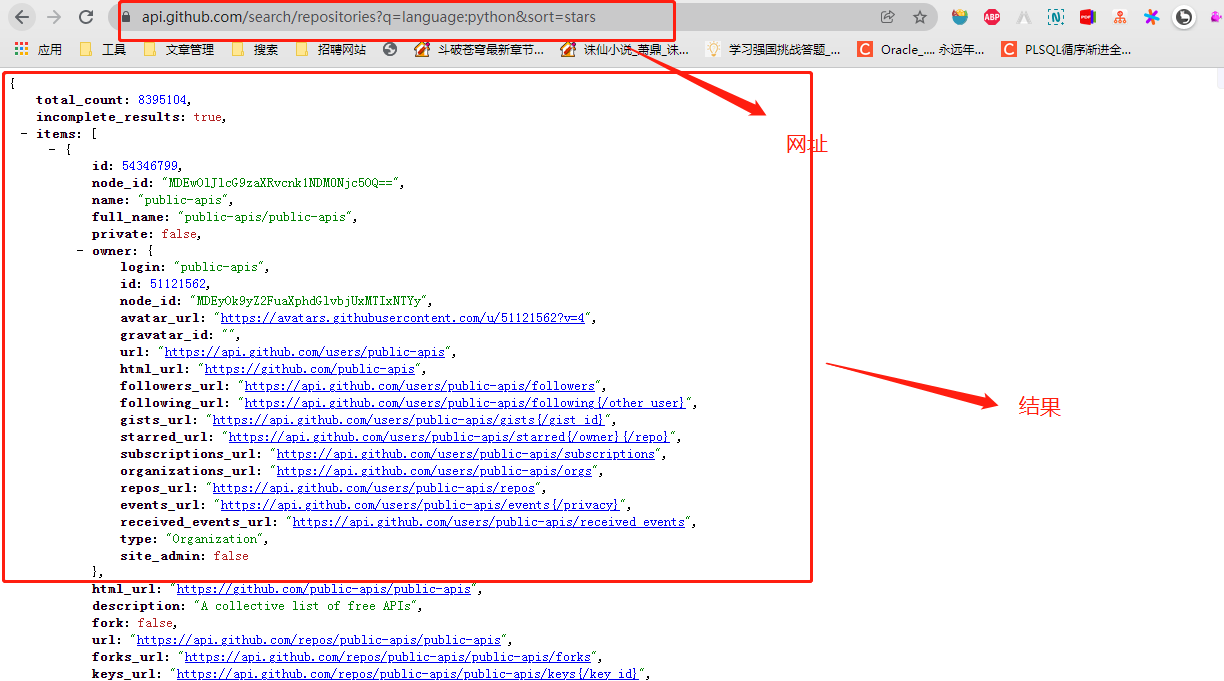 ??这个调用返回GitHub当前托管了多少个Python项目,还有有关最受欢迎的Python仓库的信息。下面来仔细研究这个调用。第一部分https://api.github.com/将请求发送到GitHub网站中响应API调用的部分;接下来的一部分search/repositories让API搜索GitHub上的所有仓库。repositories后面的问号指出我们要传递一个实参。q表示查询,而等号让我们能够开始指定查询(q=)。通过使用language:python,我们指出只想获取主要语言为Python的仓库的信息。最后一部分(&sort=stars)指定将项目按下其获得的星级进行排序。接下来显示了响应的前几行。从响应可知,该URL并不适合人工输入,具体如情况如下:  ??我们从上图中的total_count:可知,在本文撰写的时候,该GitHub总共有8634290个Python项目。incomplete_results的值为true,由此我们可以发现我们的请求不是完成成功的。当然,我们也可以显示相应的items,其中包含了GitHUb中最受欢迎的Python项目的详细信息。