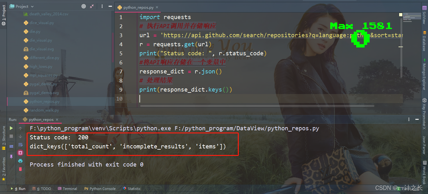 ??我们首先导入了了刚刚下载的requests的第三方模块,接着我们调用了API中的URL,然后使用requests来执行调用。我们调用get()并将URL传递给它,在将响应对象存储在变量r中。响应对象包含一个名为status_code的属性,它让我们知道请求是否成功(状态码200表示是请求成功)。最后,我们打印了status_code,核实调用是否成功了。 ??这个API返回了JSON格式的信息,因此我们使用方法json()将这些信息转换为一个Python字典。我们将转换得到的字典存储在response_dict中。最后我们打印了response_dict中的键,具体输出如下:  ??从图中执行的结果来看,状态码为200,因此,我们的调用结果是成功的。响应字典只包含了三个键items、total_count和incomplete_results。不过这里需要我们注意的是:像这样的简单调用应该会返回完整的结果集,因此完全可以忽略与incomplete_results相关联的值。但执行更复杂的API调用时,程序应检查这个值。