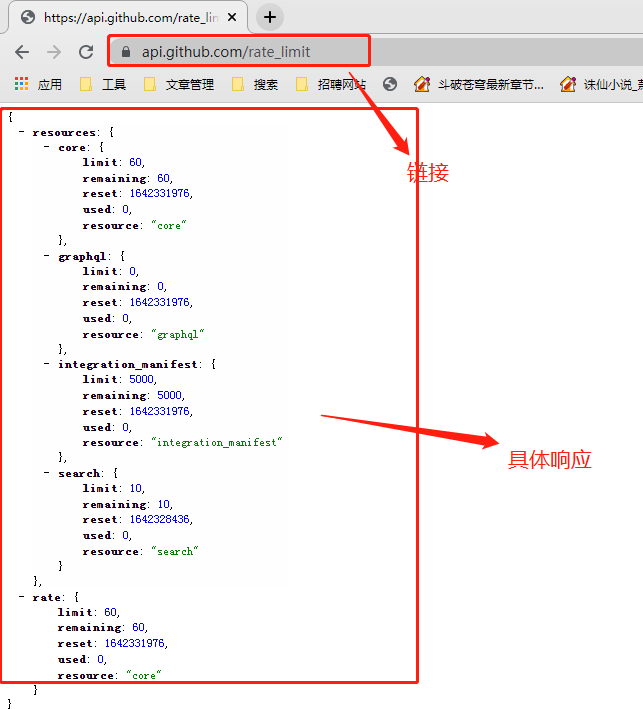 ??大多数API都存在速率限制,即你在特定时间内可执行的请求数存在限制。要获悉我们是否接近了github的限制,我们需要在浏览器中输入以下地址,我们将看到类似于下面的响应: