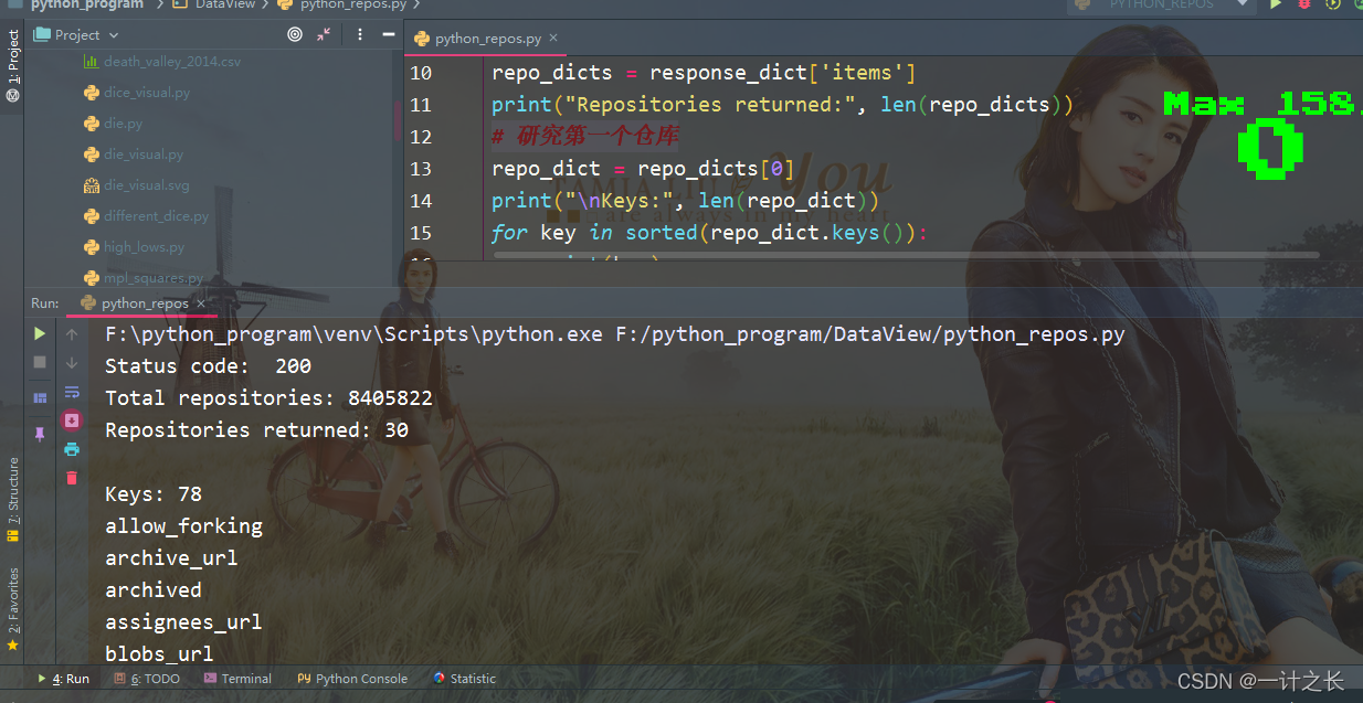 ??首先我们打印了与total_count相关联的值,它指出了github总共有多少个Python仓库。与items相关联的值是一个列表,其中包含很多字典,而每个字典都包含有关一个Python的仓库信息。接着,我们将这个字典列表存储在repo_dicts中。接下来,我们打印repo_dicts的长度,以获悉我们获得了多少个仓库的信息。为了更深入地了解返回有关每个仓库的信息,我们提取了repo_dicts中的第一个字典,并将其存储在repo_dict中,接下来,我们答应这个字典包含的键数,看看其中有多少信息,最后我们打印了这个字典所有的键,并且查看了其中包含的相关信息,具体实现情况如下:  ??GitHub的API返回有关每个仓库的大量信息:repo_dict包含68个键。通过仔细查看这些键,可大致知道可提取有关项目的哪些信息,当然,要准确地获悉API将返回哪些信息,我们要么是需要阅读文档,要么像此处这样使用代码来查看这些信息。接下来,我们提取repo_dict中与一些键相关联的值,具体实现如下: