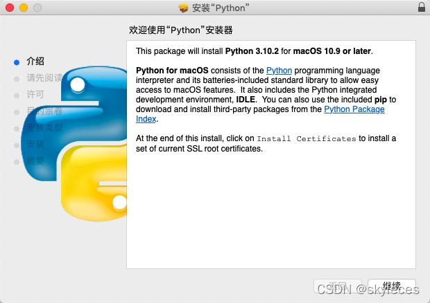 官网地址:Welcome to Python.orgThe official home of the Python Programming Language https://www.python.org/1. 双击安装包,一路点“继续”完成安装