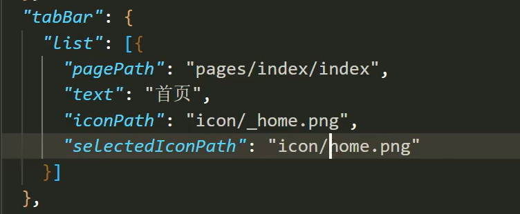 ?tip(在小程序中写上述属性时,是有提示的,而在vscode里写没有。所以建议写page文件时一般情况下在微信开发者工具里写,在写页面字体标签、样式、逻辑时用vscode写) 4.tabbar字段 11.写pages文件,写完后保存。 22.编辑tabbar tabbar里的list内容与page相对应 iconpath是未选中时的图片 selecediconpath是选中后的图片