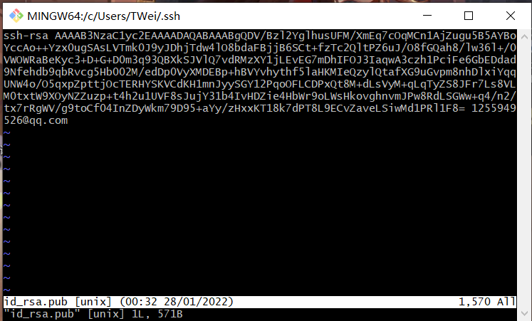如果像上面那样说明已有密钥。可以执行vi id_rsa.pub或vim id_rsa.pub查看密钥,会出现下面这个界面:  如果想要退出,则按下Esc输入:q或:wq即可回到原Git bash界面。 如果没有密钥,则执行下面的命令来生成密钥: