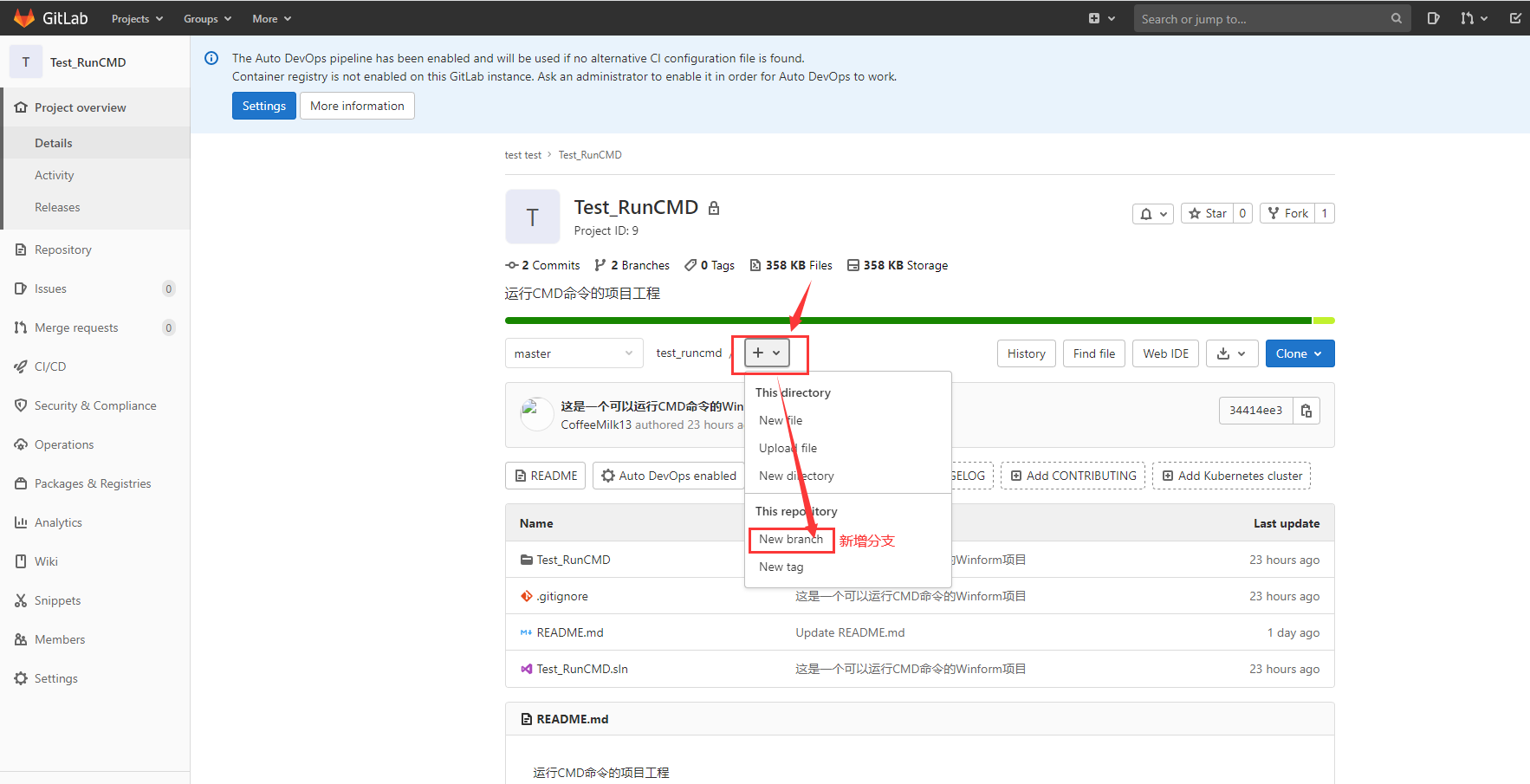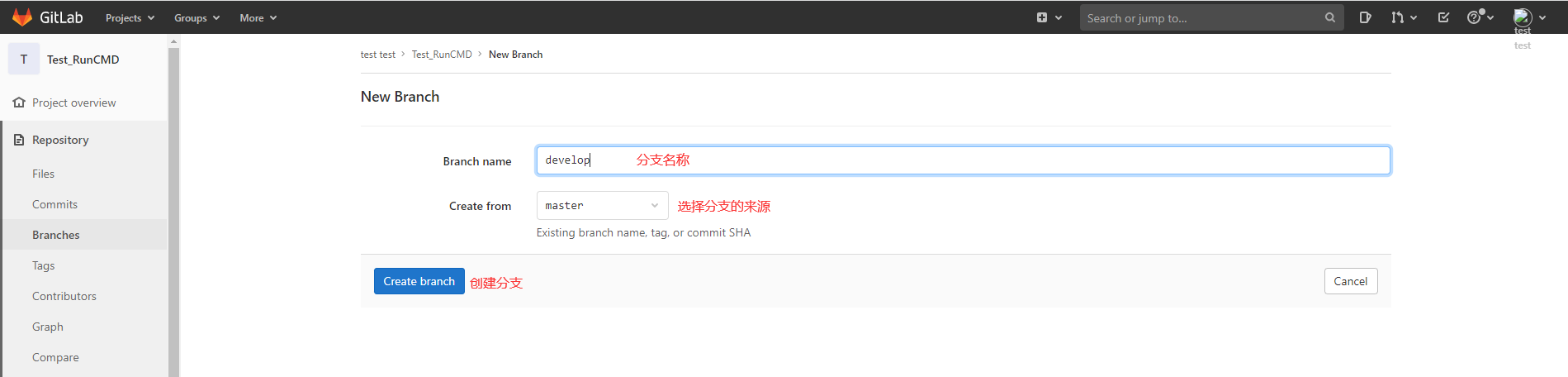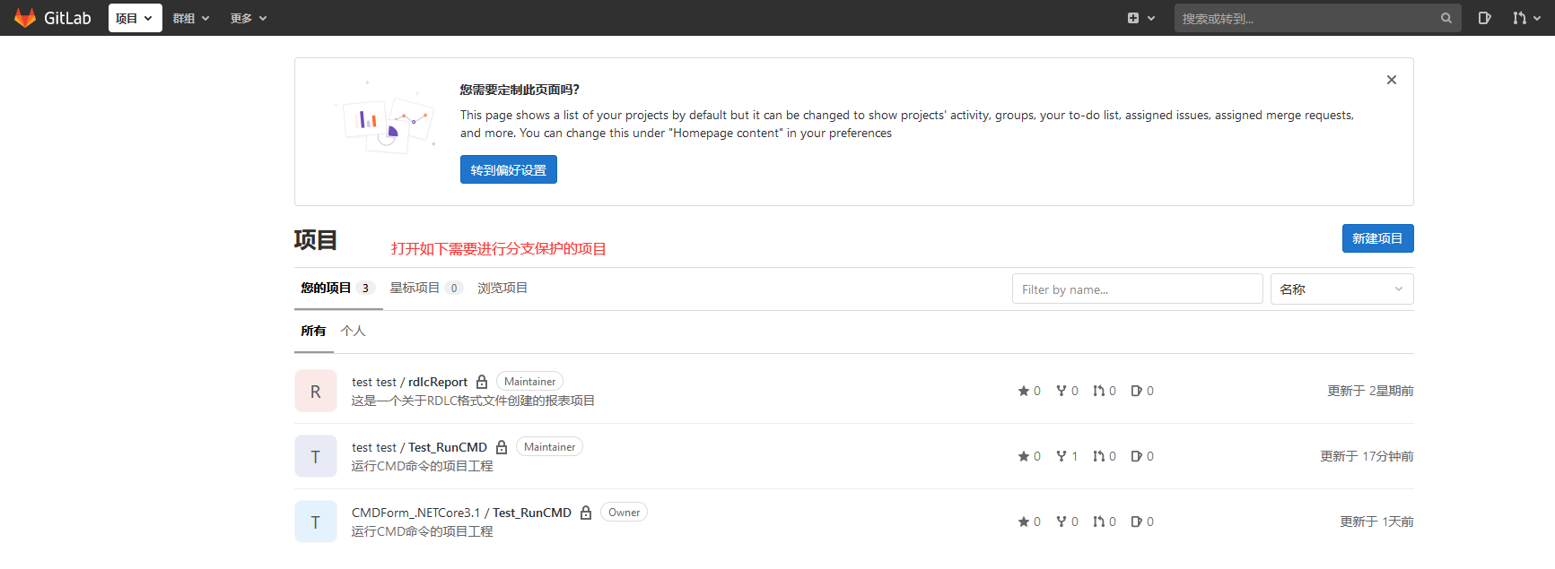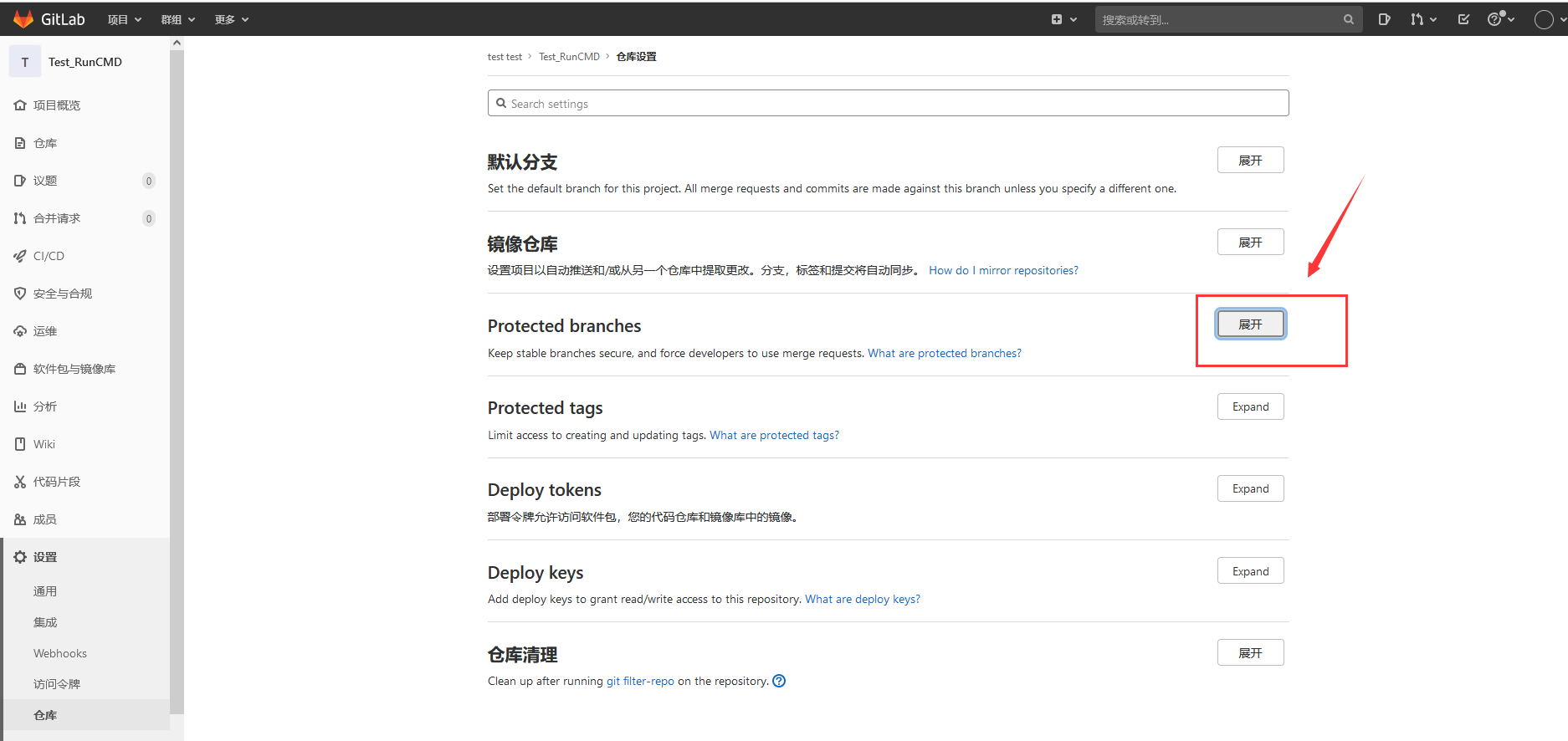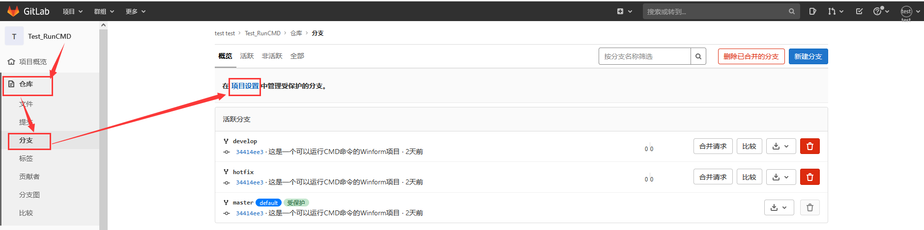 ?管理员登陆GitLab,然后打开需要进行分支保护的项目(这里以Test_RunCMD项目为例)给develop分支添加保护。
