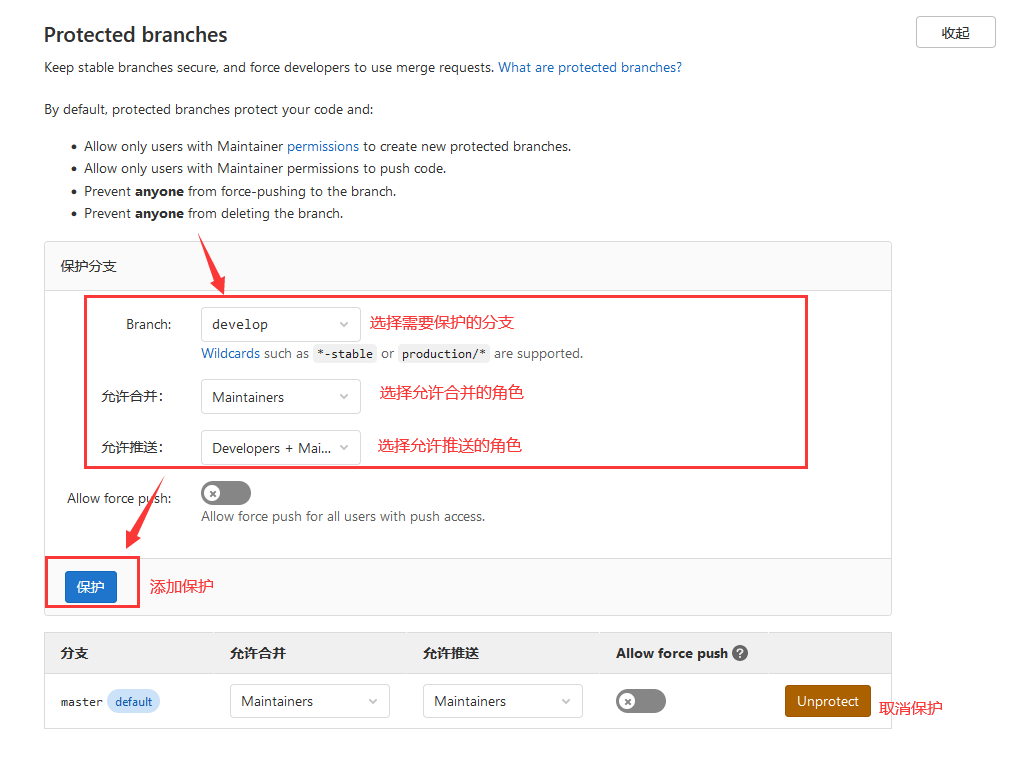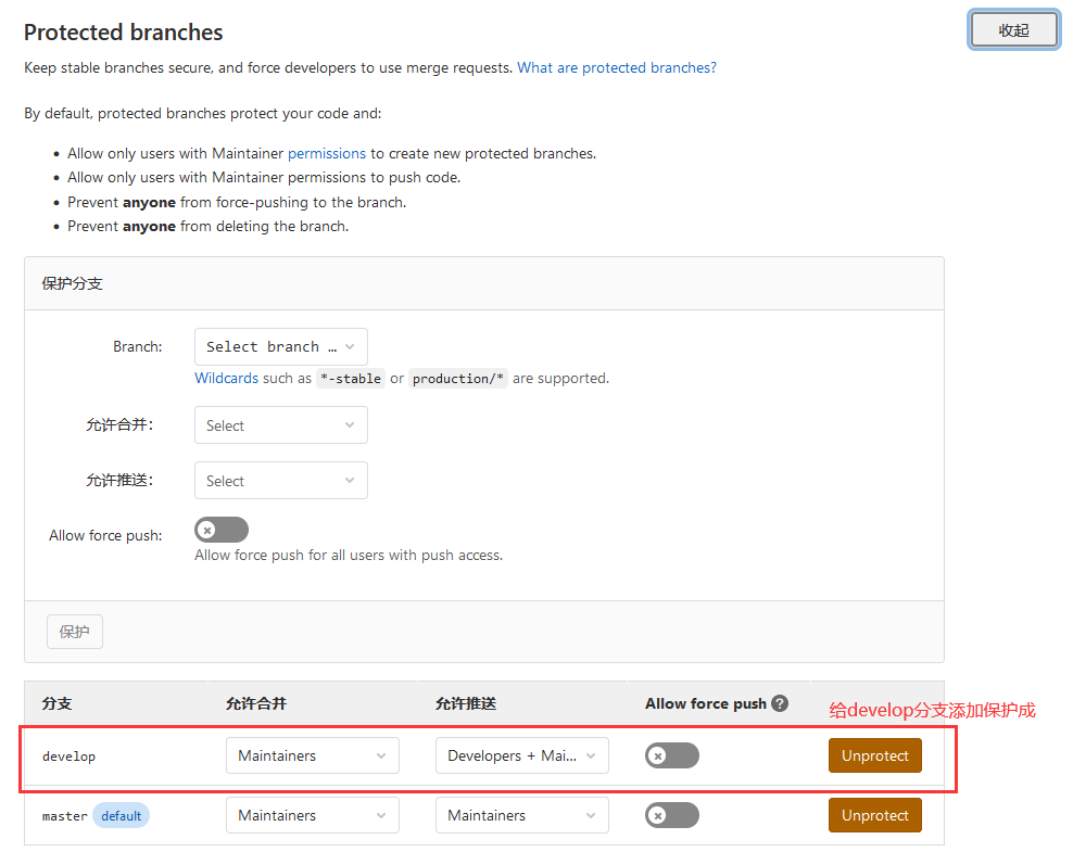 ? ? 开发人员日常开发与功能测试分支【存储最新的开发版】。如果想正式对外公布,需在Master分支上,对Develop分支进行 “合并”(merge)操作。因为Gitlab中默认对Master设置了分支保护(这个设置允许取消,如果存在多人开发的我的项目,不建议取消),所以,当须要合并到Master的时候须要在Gitlab里提交合并申请由项目管理员合并。