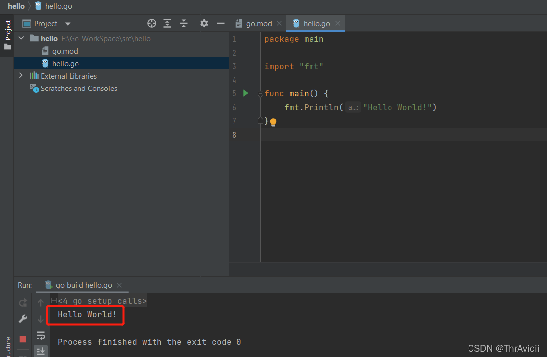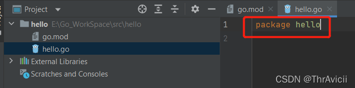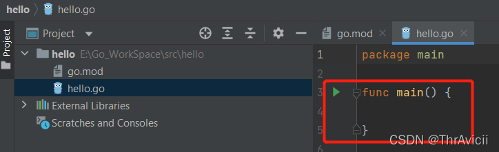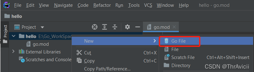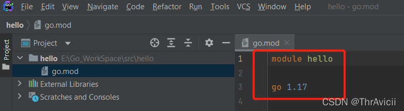 - 创建完成后展开项目名称可以看到一个 go.mod文件,会默认声明项目名称和版本信息